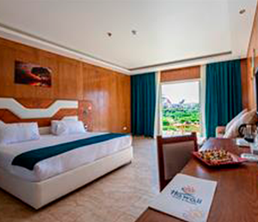Просторные номера с балконом или террасой, кондиционером, мини-баром, сейфом и видом на сад или море. Свой песчаный пляж, множество бассейнов и аквапарк — отличное сочетание отдыха и активности